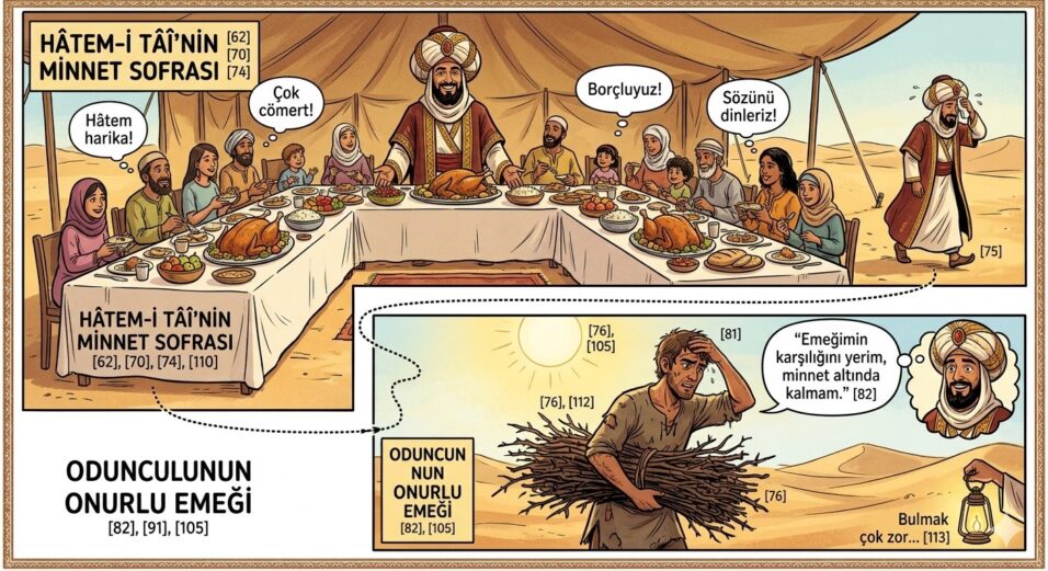 -Hey arkadaş! Bu sıcakta niçin canını dişine takıp çalı çırpıyla uğraşırsın? Bak, bugün Hâtem-i Tâî büyük bir ziyafet veriyor. Herkese açık. Git oraya, karnını güzelce bir doyur, izzet ve ikram gör…